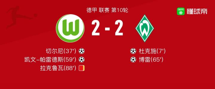 北京时间11月05日德甲 联赛 第10轮,沃尔夫斯堡主场对阵云达不莱梅。沃尔夫斯堡切尔尼破门,凯文-帕雷德斯破门。云达不莱梅杜克施破门,博雷破门。最终比分2-2。