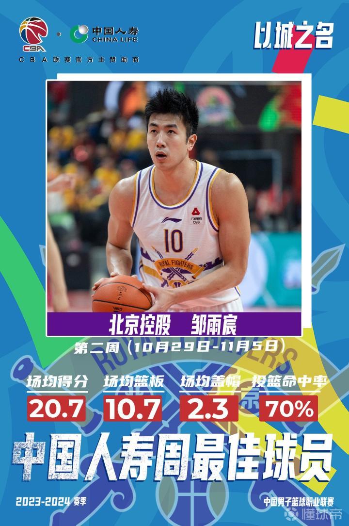 11月6日,CBA官方公布了常规赛第二周的周最佳球员,来自北京北控的邹雨宸和来自新疆的外援琼斯当选。