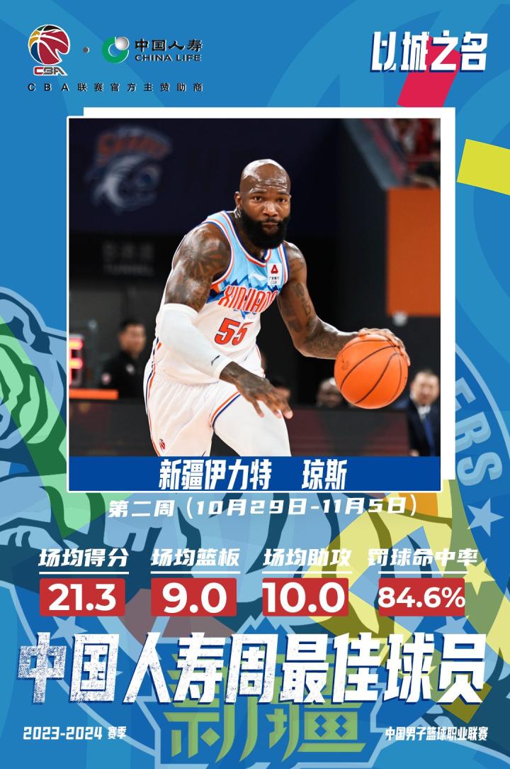本周琼斯代表新疆伊力特三战全胜,场均可以拿下21.3分、9篮板、10助攻的准三双数据。在对阵青岛国信水产的比赛中,他仅出战20分钟就拿下5分5板13助攻3抢断掌控比赛。对阵上海久事,琼斯豪取40分15篮板8助攻,对阵宁波町渥第四节和加时赛他独得13分4篮板4助攻。