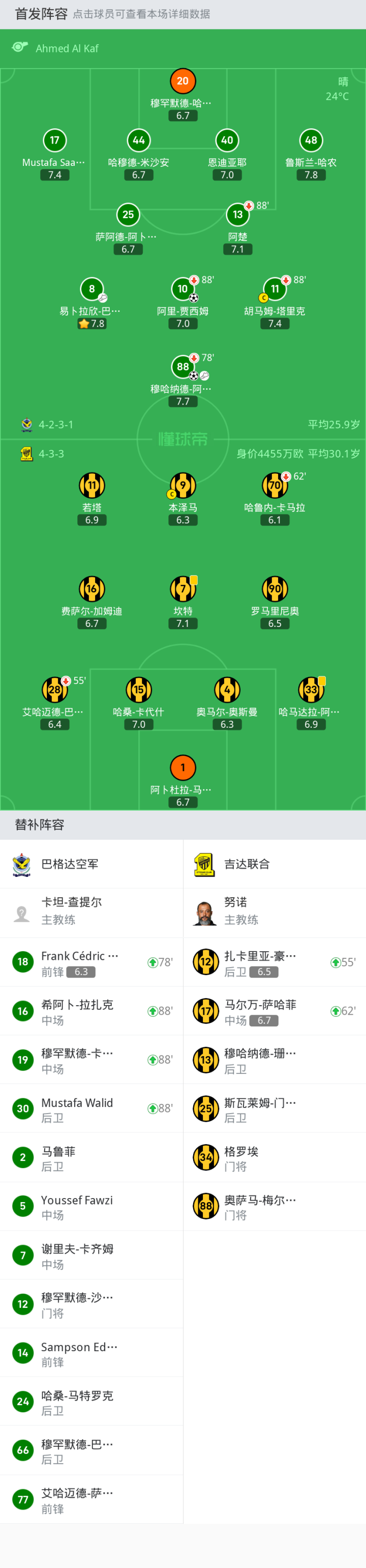吉达联合首发:9-本泽马, 1-阿卜杜拉-马约夫, 90-罗马里尼奥, 4-奥马尔-奥斯曼, 7-坎特, 33-哈马达拉-阿洛赖扬, 11-若塔, 28-艾哈迈德-巴姆沙特, 70-哈鲁内-卡马拉, 16-费萨尔-加姆迪, 15-哈桑-卡代什