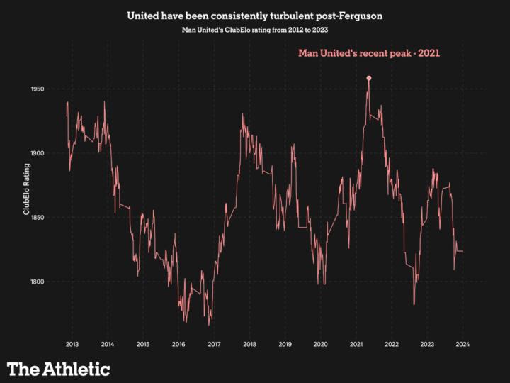 滕哈赫于2022年夏天正式入主曼联,成为自弗格森2013年退休以来的第6位正式主帅。从弗爵爷告别帅位至今,曼联再未夺得英超冠军,最好成绩是2次夺得亚军(17/18赛季和20/21赛季)。执教曼联的首个赛季,滕哈赫带队夺得联赛杯,结束了曼联长达6年的冠军荒。在滕哈赫接手曼联前后,曼联的ClubElo评分(根据球队过往的战绩评估其实力,也可用来预测未来表现)一度升至顶峰,然后回落至低谷。