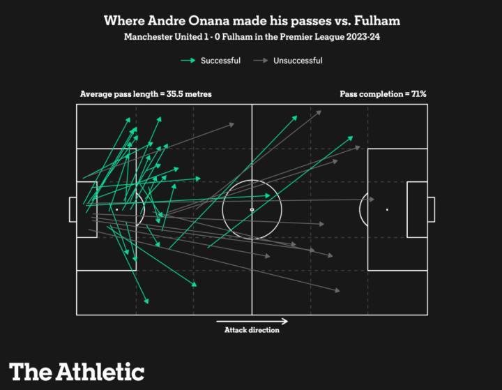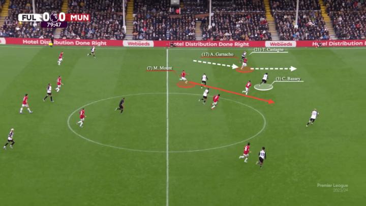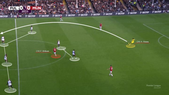 滕哈赫选择让埃里克森出任单后腰,而富勒姆锋线上的两名攻击手靠得比较近。曼联被迫得从后卫线直接用长传向前推进,然后尝试控制下二点球,而他们最喜欢找的点是左路的加纳乔。比如下面这脚传球,奥纳纳直接开大脚,但没能联系上队友。