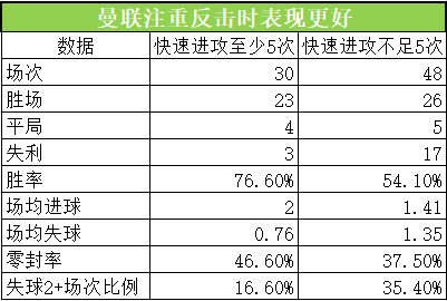 曼联防反更多的时候就是表现更好。最近两个赛季所有比赛合计,曼联至少完成5次快速进攻的比赛中胜率高达76.6%,快速进攻不超过4次的比赛中胜率仅为54.1%。曼联反击比例更高时的进球数、失球数和零封场次都要好得多。