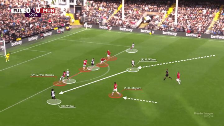 威尔逊在没有受到任何防守压力的情况下推进至前场,并分球给威廉——富勒姆此时形成了五打四的局面。威廉的倒三角传中被马奎尔和万-比萨卡联手拦挡,之后麦克托米奈大脚解围。