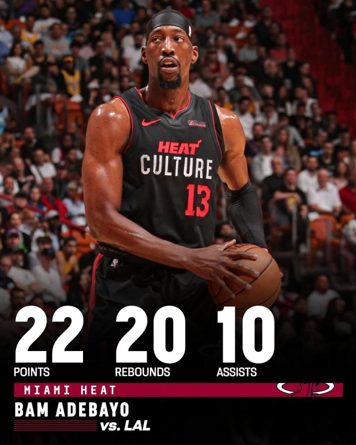 热火队史首位达成此成就球员,阿德巴约砍22分20篮板10助攻德鲁飞鱼 @懂球帝2023-11-07 13:34今天结束的NBA常规赛,热火108-107险胜湖人,阿德巴约得到22分20篮板10助攻,创下队史新纪录。本场比赛阿德巴约投篮20中9,命中1记三分并且罚球5中3,拿到5个进攻篮板和15个后场篮板,据统计他是热火队史首位达成至少20分20篮板10助攻的球员。本赛季阿德巴约场均得到21.5分9.2篮板3.8助攻,目前热火3胜4负排名东部第11。展开更多