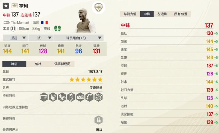 亨利可以打中锋,还能打边锋,和现实一样,从左路内切杀到禁区,边转中的过程后卫不太容易阻拦他。在所有ICON TM球员里,亨利现在价格最贵,这是他最大短板,本期介绍的其他三位性价比更高。
