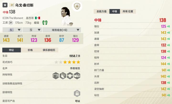 乌戈.桑切斯相比上面三位,游戏里的知名度低一些,不过ICON TM的实战表现完全不虚,是张“低调”的强力前锋。这四个前锋里,桑切斯是唯一有“善于头球”特性的,桑切斯还有最好的弹跳,所以经常能高高跃起、头槌破门,传中打法也能用。