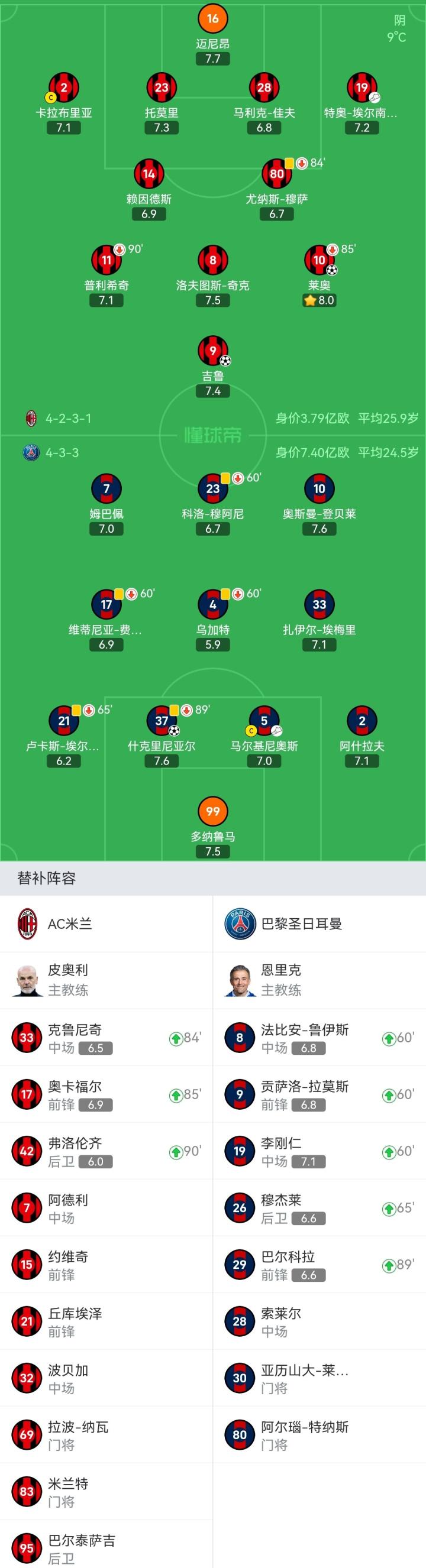 AC米兰首发:16-迈尼昂、2-卡拉布里亚、23-托莫里、28-马利克-佳夫、19-特奥-埃尔南德斯、8-洛夫图斯-奇克、80-尤纳斯-穆萨(84'33-克鲁尼奇)、14-赖因德斯、11-普利希奇(90+2'42-弗洛伦齐)、10-莱奥(84'17-奥卡福尔)、9-吉鲁