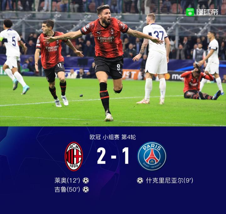 杰士邦 | 欧冠战报:米兰2-1逆转巴黎,莱奥倒钩破门吉鲁制胜