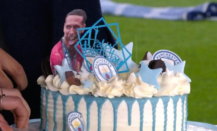 费迪南德在现场收到了一个带有曼城队徽的蓝色生日蛋糕,而且这个蛋糕上还有他举着英超奖杯的照片。