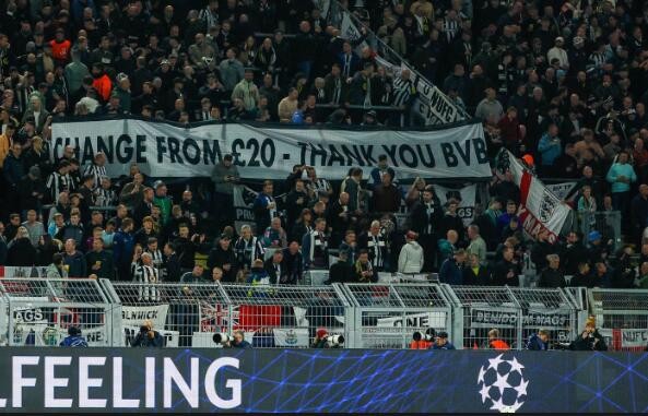 在本轮欧冠比赛中,多特蒙德主场2-0击败纽卡斯尔联,比赛中纽卡斯尔联球迷举起横幅感谢多特主场的便宜票价。