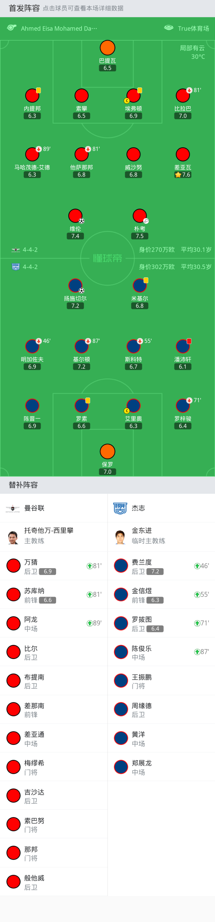 曼谷联首发:29-维伦, 3-埃弗顿, 93-马哈茂德-艾德, 39-朴考, 2-比拉巴, 1-巴提瓦, 6-内提邦, 19-差亚瓦, 26-素攀, 17-他萨那邦, 8-威沙努