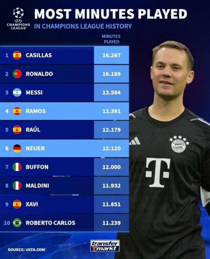 德转数据统计,欧冠史上出场时间最长的球员排行榜,...
