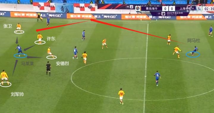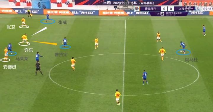 (图)2分37秒,阿马杜接球瞬间,此时张卫开始拖后,许东则有一个向前的压迫,安德烈还站在马莱莱的侧后方。不难看出,张卫的拖后明显是为了防止申花张威从肋部斜插,而许东的前压,一方面可以压制张威(白箭)与曹赟定(橙箭)的前插,另一方面也可以尝试提前拦截向马莱莱送出的传球。可以这样说,海牛的防线一开始就没有按照造越位的战术来实施。