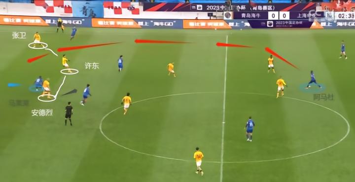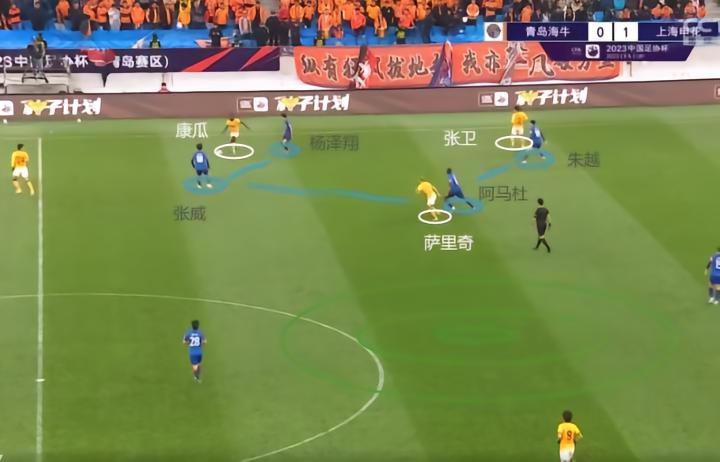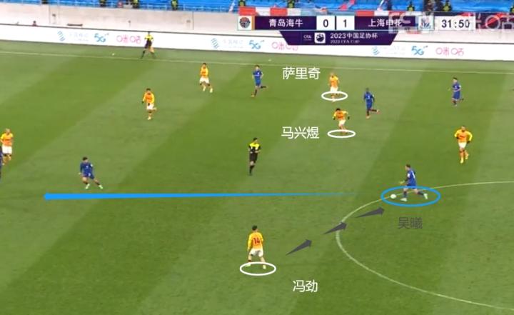 应该说,考虑到吴曦与阿马杜这两名“六边形战士”,安东尼奥还是进行一定程度上的布置。本场比赛海牛的进攻大多集中在两翼,马兴煜与萨里奇频繁拉边,试图避开申花中路的拦截,在边路寻找机会。于是在左路,海牛形成了“张卫——康瓜——萨里奇”的三人强侧,在右路形成了“王建明——冯劲——马兴煜”的三人强侧。