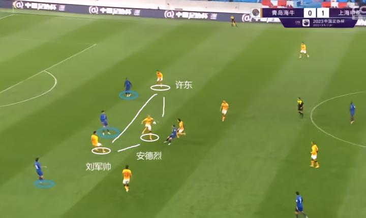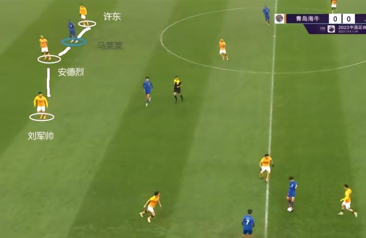 (图)这是安德烈与马兴煜在后腰位置上的合力解围,此时身后的刘军帅和许东造越位成功,安德烈的前压选择才是合理的