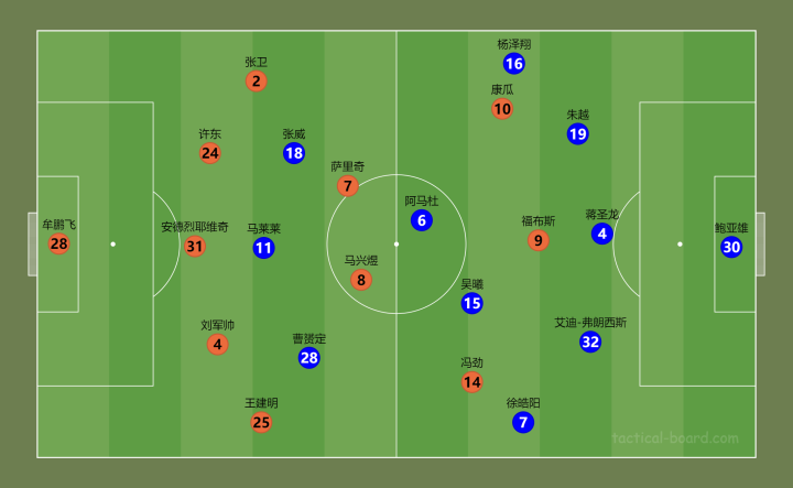 申花这边,吴金贵同样排出523阵型,门将鲍亚雄,三中卫艾迪、朱越与蒋圣龙,徐皓阳与杨泽翔分居左右边翼卫,双中场吴曦、阿马杜,前场三叉戟则为曹赟定、马莱莱与张威。