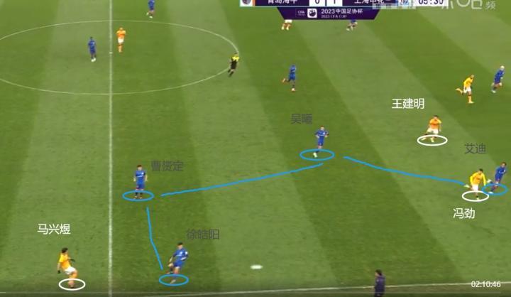 (图)由于海牛双中场拉边后来不及回防,吴曦拿球后一路突破(蓝箭),距离最近的冯劲没有选择补防(黑箭),而是在散步看戏