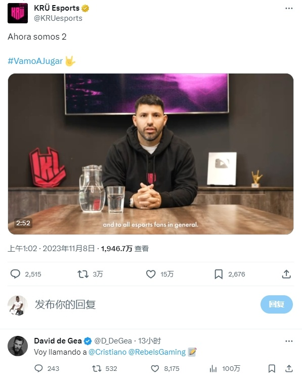 近日,阿根廷球星塞尔希奥-阿圭罗在社交平台上宣布,他的前国家队队友以及“好基友”里奥-梅西正式成为其电竞俱乐部KRÜ Esports的共同所有人。前曼联队门将德赫亚也评论此条动态表示:“我要给C罗打电话了。”