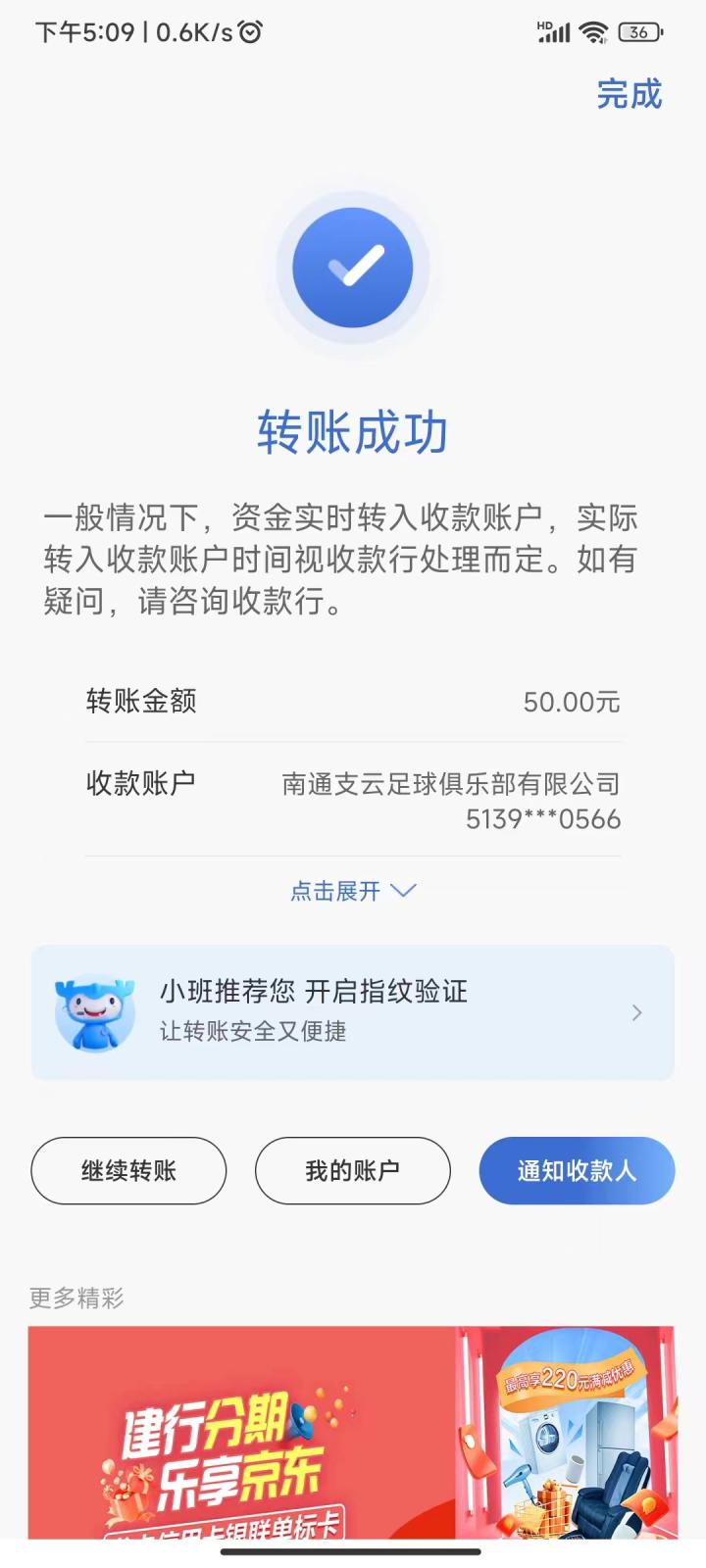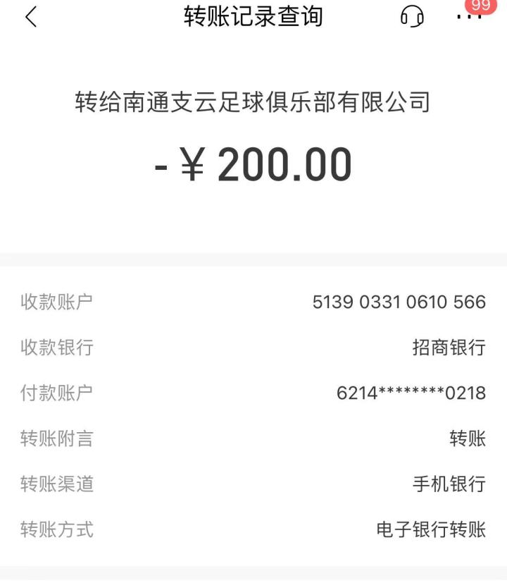 在俱乐部面临五万元罚款后,南通支云球迷纷纷向俱乐部账户转账,以示众筹这一罚单