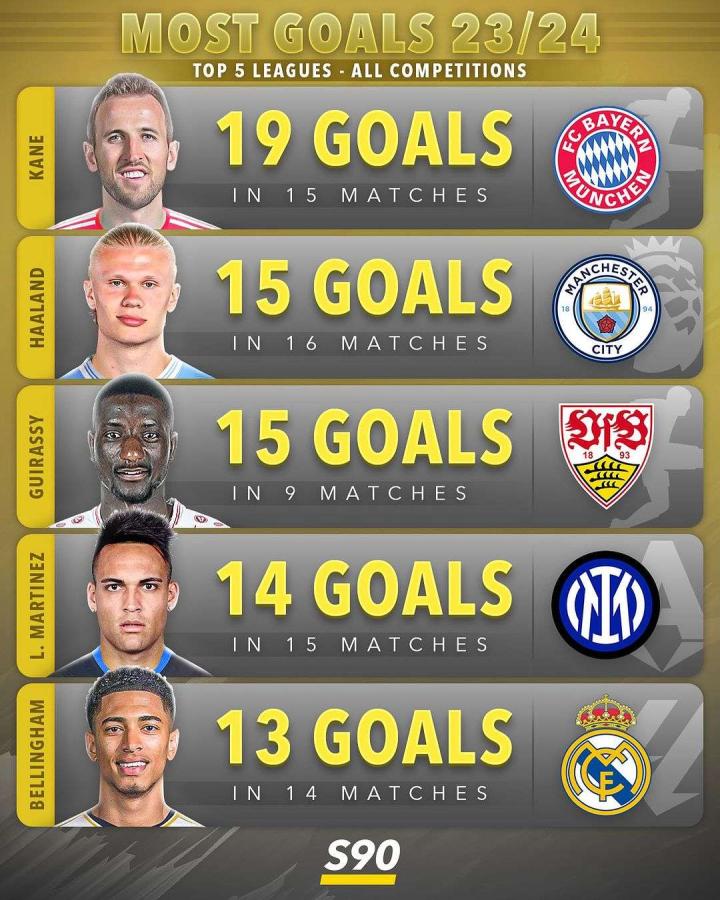2023/2024赛季欧洲五大联赛球员进球榜,英...球迷20644169 @懂球帝2023-11-10 01:332023/2024赛季欧洲五大联赛球员进球榜,英格兰队长凯恩15场19球遥遥领先于其他人,另外非常值得一提的是吉拉西和中场贝林厄姆,还有两位是金球奖的本来获奖者哈兰德和另一个世界杯冠军劳塔罗。 不过现役第一人姆巴佩卻不在这里展开更多