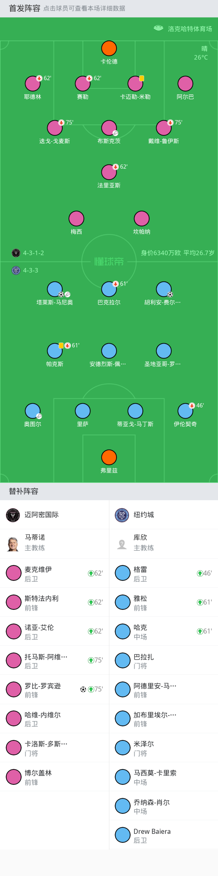 迈阿密国际首发:10-梅西, 18-阿尔巴, 5-布斯克茨, 2-耶德林, 31-卡迈勒-米勒, 9-坎帕纳, 11-法里亚斯, 1-卡伦德, 8-迭戈-戈麦斯, 15-赛勒, 41-戴维-鲁伊斯