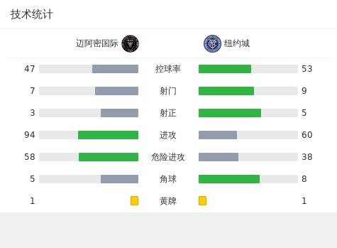 第44分钟,纽约城率先破门,马尼奥进球,1-0领先迈阿密国际