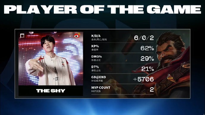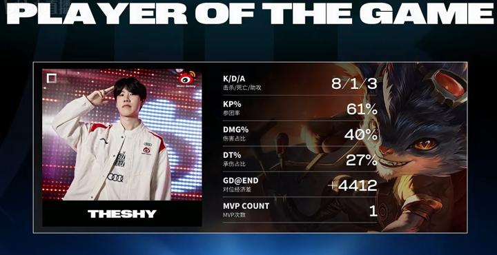 第3分钟,上路对线,BIN单杀Theshy拿下一血,随后被塔换掉。