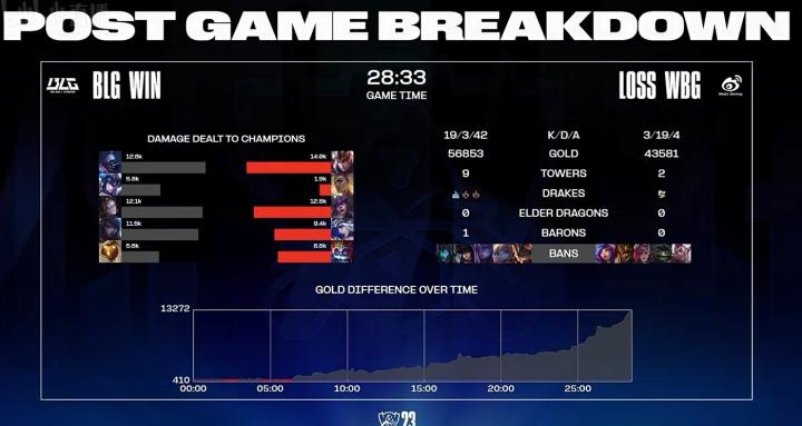 第28分钟,BLG在拿到大龙后一波推进顺势拿下比赛。
