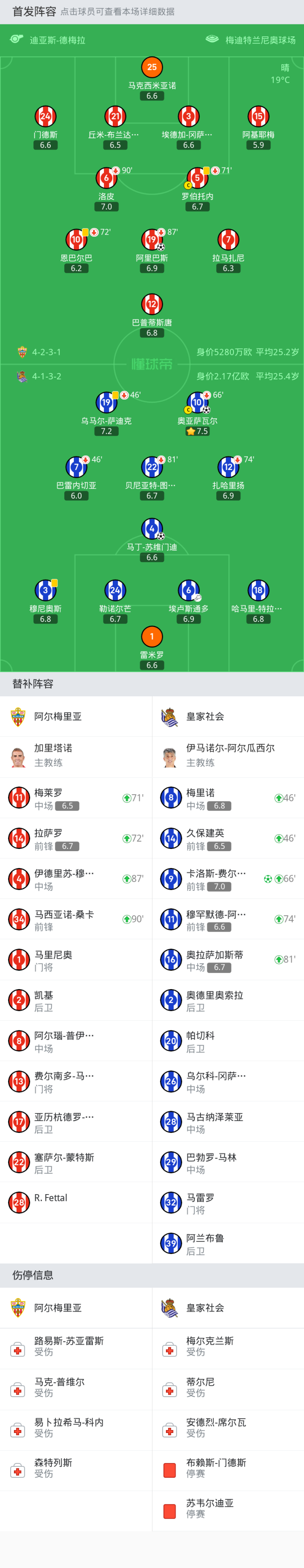 阿尔梅里亚首发:12-巴普蒂斯唐, 10-恩巴尔巴, 21-丘米-布兰达里斯, 3-埃德加-冈萨雷斯, 24-门德斯, 15-阿基耶梅, 25-马克西米亚诺, 5-罗伯托内, 7-拉马扎尼, 6-洛皮, 19-阿里巴斯