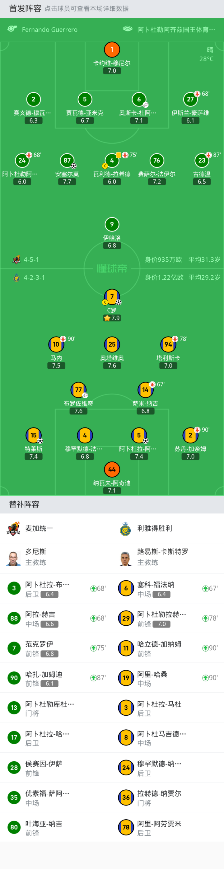 利雅得胜利首发:7-C罗, 15-特莱斯, 77-布罗佐维奇, 4-穆罕默德-法蒂勒, 10-马内, 25-奥塔维奥, 94-塔利斯卡, 2-苏丹-加奈姆, 14-萨米-纳吉, 5-阿卜杜拉-阿姆里, 44-纳瓦夫-阿奇迪