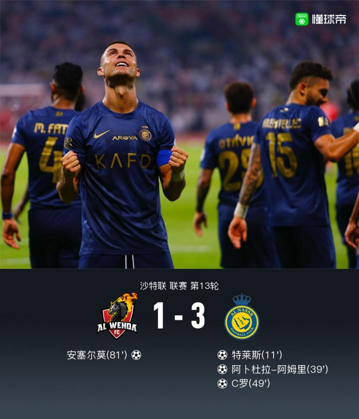 利雅得胜利3-1麦加统一,C罗建功,阿姆里、特莱斯赛季首球