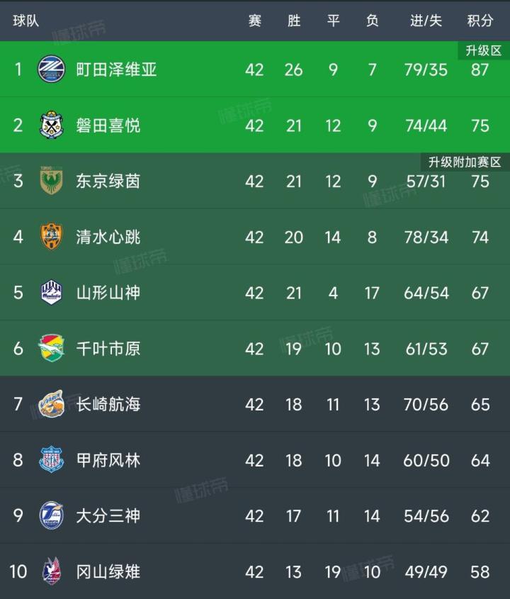 本赛季J2联赛42轮常规赛全部结束,町田泽维亚与磐田喜悦成功升入J1。