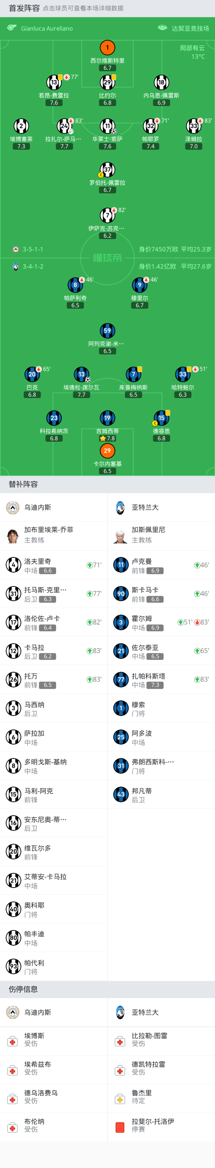 乌迪内斯首发:37-罗伯托-佩雷拉, 1-西尔维斯特里, 7-伊萨克-苏克塞斯, 11-华莱士-索萨, 18-内乌恩-佩雷斯, 29-比约尔, 32-帕耶罗, 13-若昂-费雷拉, 24-拉扎尔-萨马尔季奇, 33-泽姆拉, 2-埃博塞莱