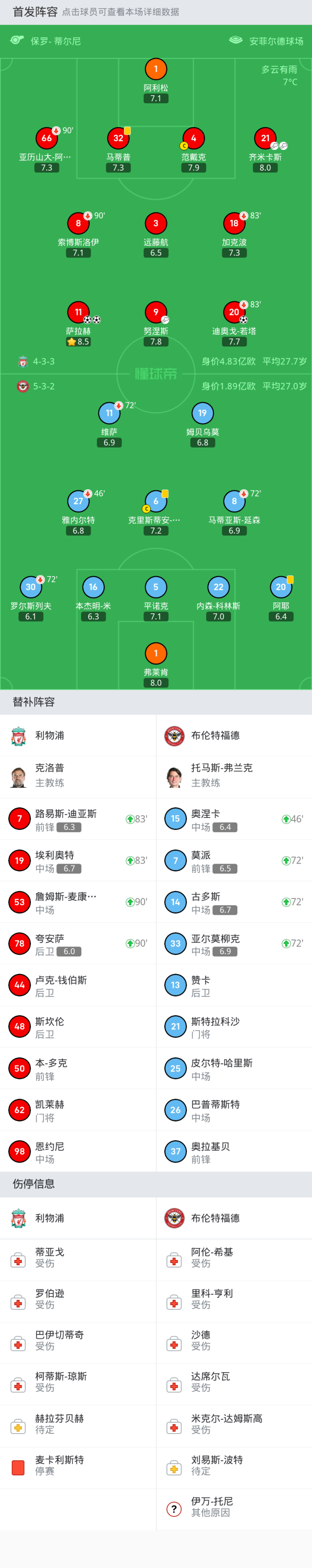 替换下场:83'20-迪奥戈-若塔, 90'66-亚历山大-阿诺德, 83'18-加克波, 90'+48-索博斯洛伊