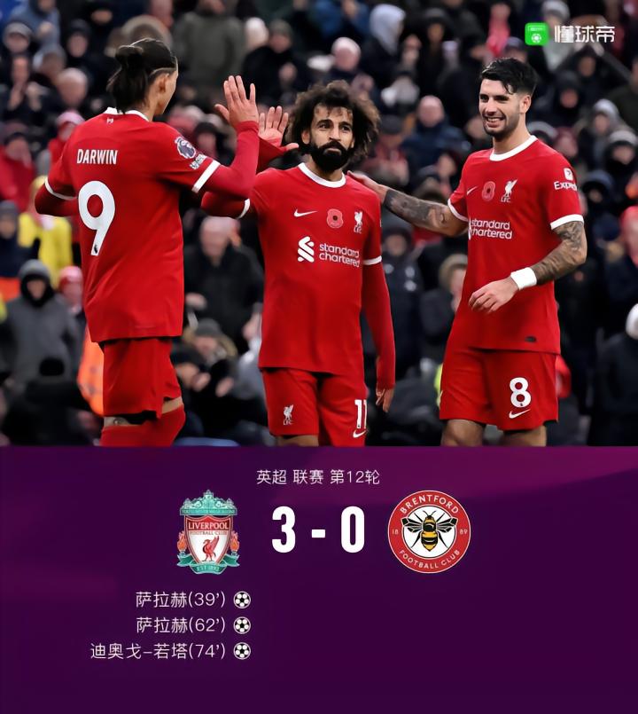 北京时间11月12日英超联赛第12轮,利物浦主场对阵布伦特福德。上半场努涅斯越位进球“梅开二度”后助攻萨拉赫打破僵局;下半场萨拉赫头球破门完成梅开二度,若塔世界波破门锁定胜局。最终利物浦主场3-0轻取布伦特福德。