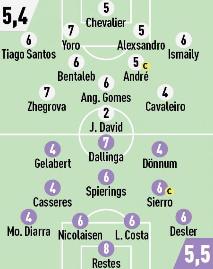 图卢兹1-1里尔评分:雷斯特8分最高,戴维2分