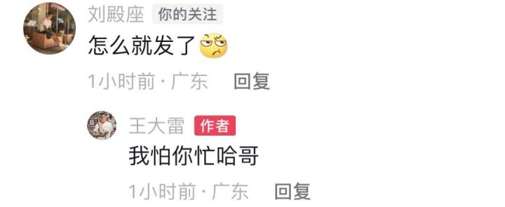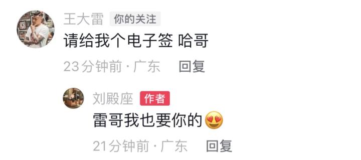 随后,王大雷在评论区留言:“请给我个电子签名,哈哥。”刘殿座回复:“雷哥我也要你的。”
