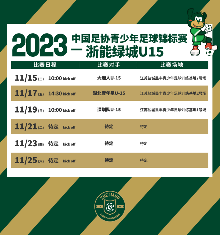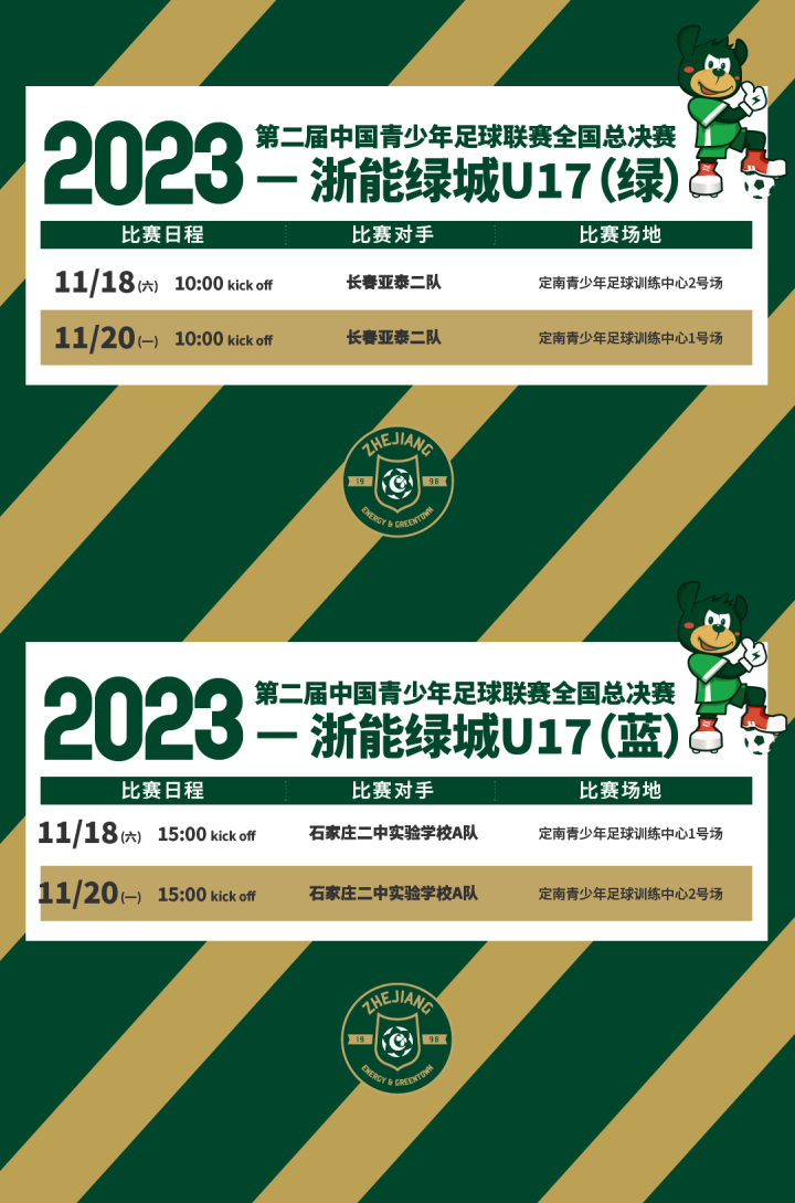 2023年第二届中国青少年足球联赛(U19组)第四阶段、(男子高中年龄段U17组)全国总决赛八强赛赛程都出炉啦。 浙江U19队即将迎来A组最后一阶段的较量,本阶段比赛也将决定今年U19组的最终排名。浙能绿城U17绿蓝两队则将携手展开全国八强(争冠组)的挑战。 另外,浙能绿城U15队也将在本周开始2023中国足协青少年足球锦标赛第二阶段的赛事。请一起关注浙能绿城青年军的表现,为他们加油!