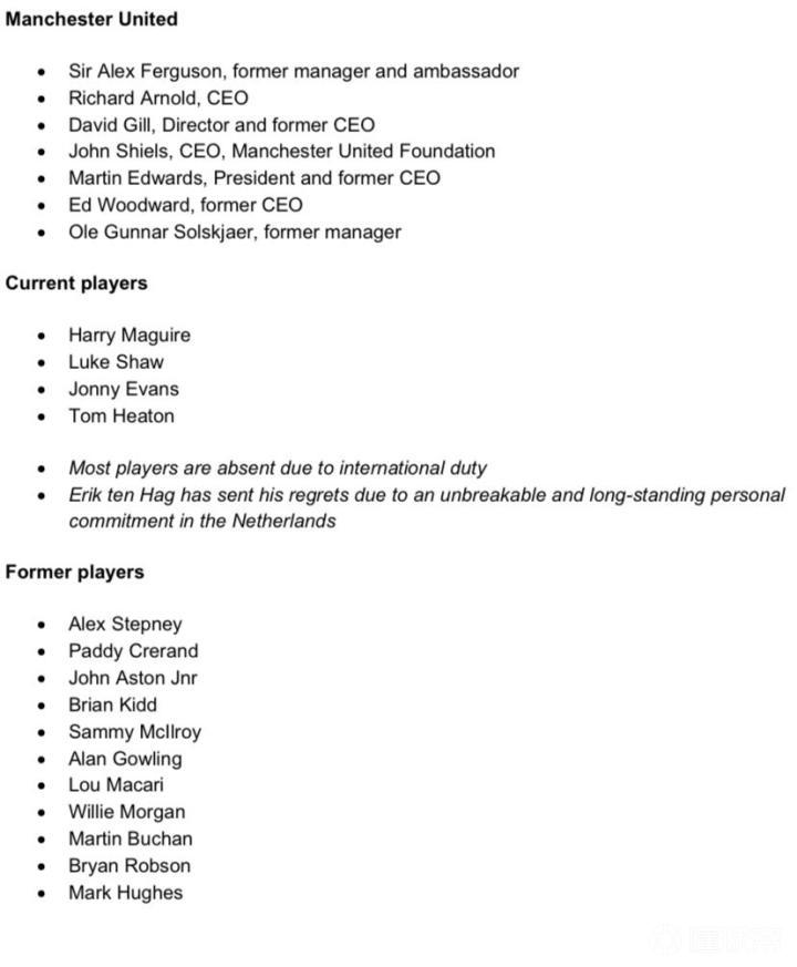格雷泽家族的任何人都不会出席,因为他们不想分散注意力。现任曼联主帅滕哈格因在荷兰早就定好、无法避开的私事(an unbreakable and long-standing personal commitment in the Netherlands.)而缺席。
