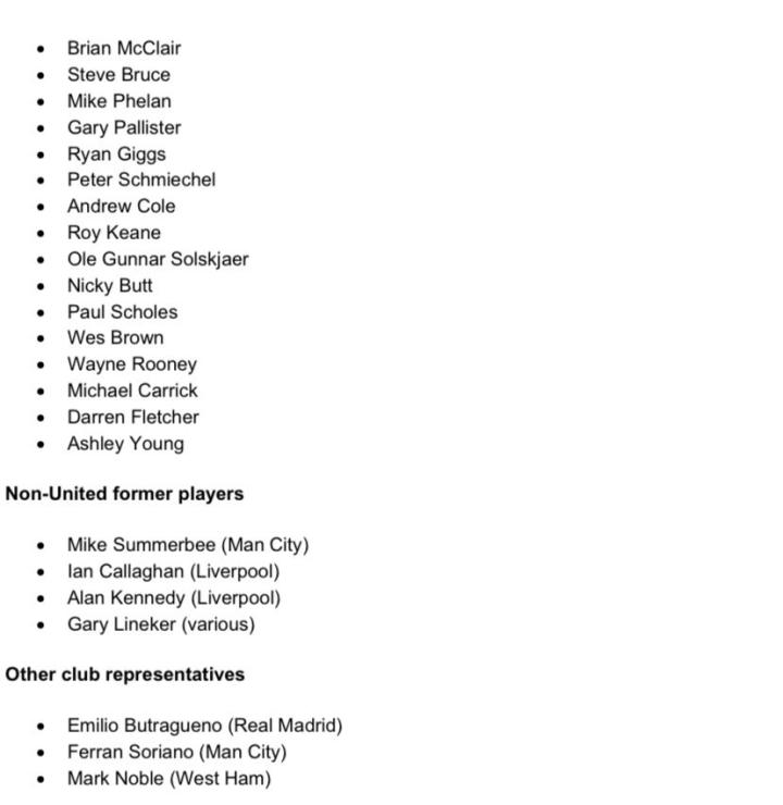 参加查尔顿爵士的葬礼名单中,弗格森爵士、索尔斯克亚、罗伊-基恩、鲁尼和瑞安-吉格斯均在列。