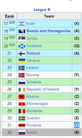 排名第五的芬兰在还剩两轮的情况下落后第二名丹麦7分,已经无法直通欧洲杯,也将参加附加赛。