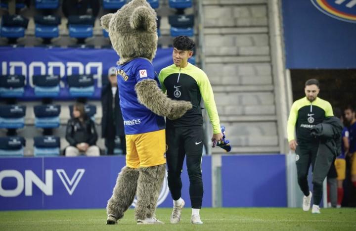 何小珂与FC安道尔的吉祥物 上一轮联赛他首次进入西乙大名单
