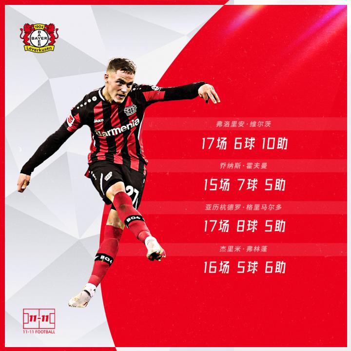 11-11数据库//战绩轨迹 勒沃库森:狂飙 德甲联赛目前已经进行了11轮,勒沃库森以10胜1平积31分的战绩继续排名德甲榜首,领先联赛第二、德甲已经十一连冠的南大王拜仁2分。近期,勒沃库森联赛取得7连胜,而各赛事更是达到了12连胜。 勒沃库森的狂飙,离不开少帅哈维·阿隆索的调教,42岁的龙哥已经成为各豪门争抢的目标。勒沃库森队中的多名球员都在他的调教下拿出了现象级别的表现: 弗洛里安·维尔茨:大伤痊愈归来的德国天才本赛季已经送出9次助攻,领衔五大联赛助攻榜。 乔纳斯·霍夫曼:在今年,这位31岁的德国前锋已经直接参与24球(14球10助)。 格里马尔多和弗林蓬:阿隆索3-4-2-1体系的边翼卫位置让这两名飞翼大放异彩,打出了顶级边锋才有的数据。 当然,积分榜第二的拜仁慕尼黑至今同样在德甲未尝一败。只是阿隆索引领的“狂飙”日渐强大,拜仁往年在德甲的霸主地位又迎来了空前强大的挑战。 那个,哈里·凯恩的家属,让当事人先冷静一下…