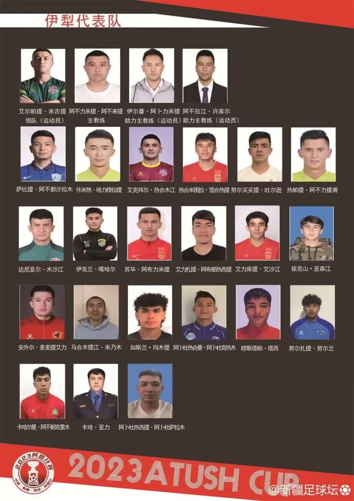 2023年阿图什杯球队巡礼–伊犁队 领队:艾尔帕提·米吉提 主教练:阿不力提·阿不来提 助力教练:伊尔番·阿卜力米提 助力教练:阿不拉江·许库尔 球员: 1.萨比提·阿不都沙拉木(长春亚泰) 2.佧米然·哈力穆拉提(石家庄功夫) 3.艾克拜尔·热合木江(伊犁九城) 4.热合米图拉·雪合热提(济南兴洲) 5.努尔买买提·吐尔逊(广西恒宸) 6.热帕提·阿不力提甫(武汉小马过河) 7.达尼亚尔·木沙江 8.伊克兰·喀哈尔 9.苏毕·阿布力米提(江西庐山) 10.艾力扎提·阿布都热西提(大连华谊) 11.艾力库提·艾沙江(大连人) 12.依克山·亚森江 13.安外尔·麦麦提艾力 14.马合木提江·米乃木 15.如斯兰·玛木提(伊犁九城) 16.阿卜杜热合曼·阿杜克热木(海南之星) 17.穆斯塔帕·塔西(山东泰山) 18.努尔扎提·努尔兰 19.卡哈尔曼·阿不都克里木(丹东腾跃) 20.卡哈·亚力 21.阿卜杜热西提·阿卜杜萨拉木 22.伊尔番·阿卜力米提 23.阿不拉江·许库尔