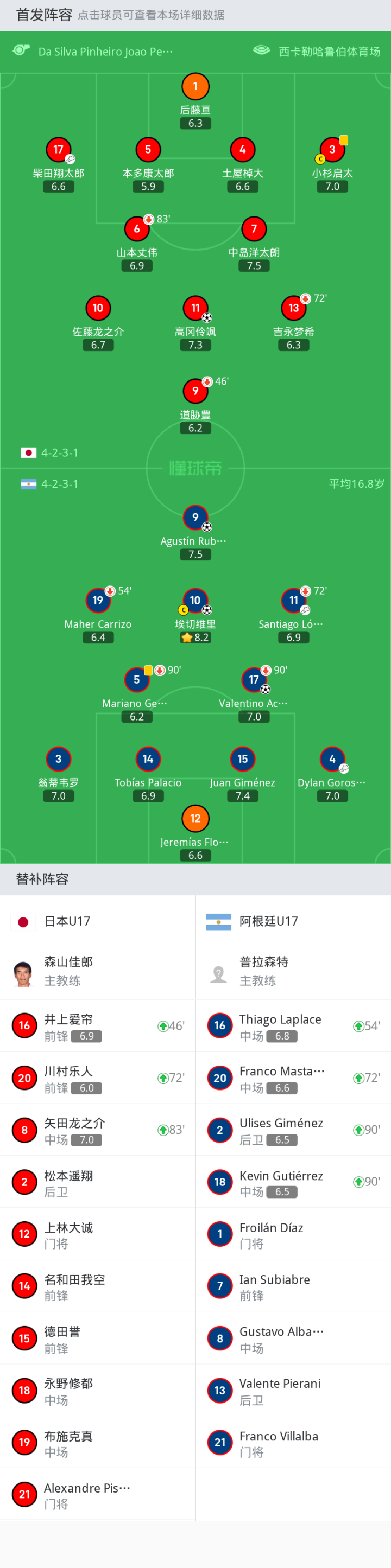 阿根廷U17首发:10-埃切维里, 3-翁蒂韦罗, 5-Mariano Gerez, 4-Dylan Gorosito, 9-Agustín Ruberto, 17-Valentino Acuña, 14-Tobías Palacio, 11-Santiago López, 15-Juan Giménez, 19-Maher Carrizo, 12-Jeremías Florentín