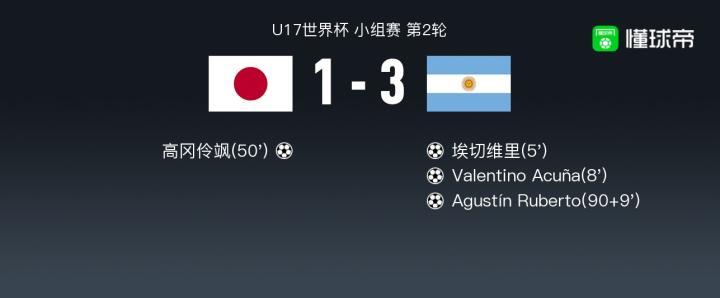 北京时间11月14日U17世界杯 小组赛 第2轮,日本U17主场对阵阿根廷U17。日本U17高冈伶飒破门。阿根廷U17埃切维里破门,Valentino Acuña破门,Agustín Ruberto破门。最终比分1-3。