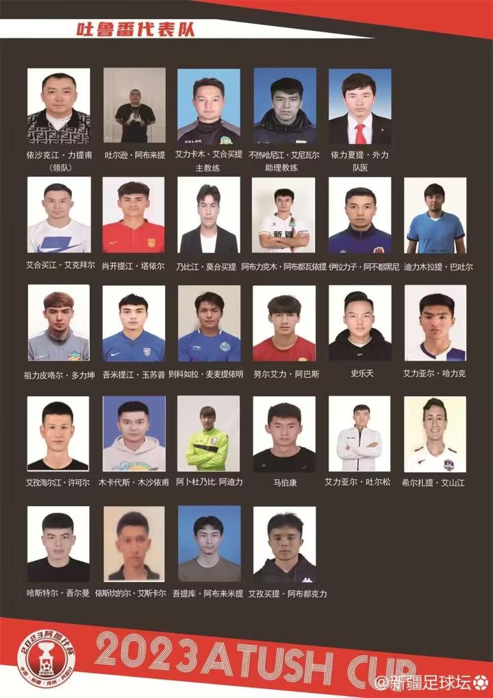 2023年阿图什杯球队巡礼–吐鲁香队领队:依沙克江·力提甫 主教练:艾力卡木·艾合买提 助理教练:吐尔逊·阿布来提 助理教练:不热哈尼江·艾尼瓦尔 队医:依力夏提·外力 球员: 1.艾合买江·艾克拜尔(阿拉尔三五九) 2.肖开提江·塔依尔(海南之星) 3.乃比江·莫合买提(北京国安) 4.阿布力克木·阿布都瓦依提 5.伊拉力丁·阿不都黑尼(泉州亚新) 6.迪力木拉提·巴吐尔 7.祖力皮喀尔·多力坤 8.吾米提江·玉苏普(海南之星) 9.则科如拉·麦麦提依明(海南之星) 10.努尔艾力·阿巴斯(北京国安) 11.史乐天(海南之星) 12.艾力亚尔·哈力克 13.艾孜海尔江·许可尔 14.木卡代斯·木沙依甫(长春喜都) 15.阿卜杜乃比·阿迪力 16.马伯康(绍兴上虞翼龙) 17.艾力亚尔·吐尔松(新疆领梦者) 18.希尔扎提·艾山江(广西恒宸) 19.哈斯特尔·吾尔曼 20.依斯坎的尔·艾斯卡尔 21.吾提库·阿布来米提 22.艾孜买提·阿布都克力