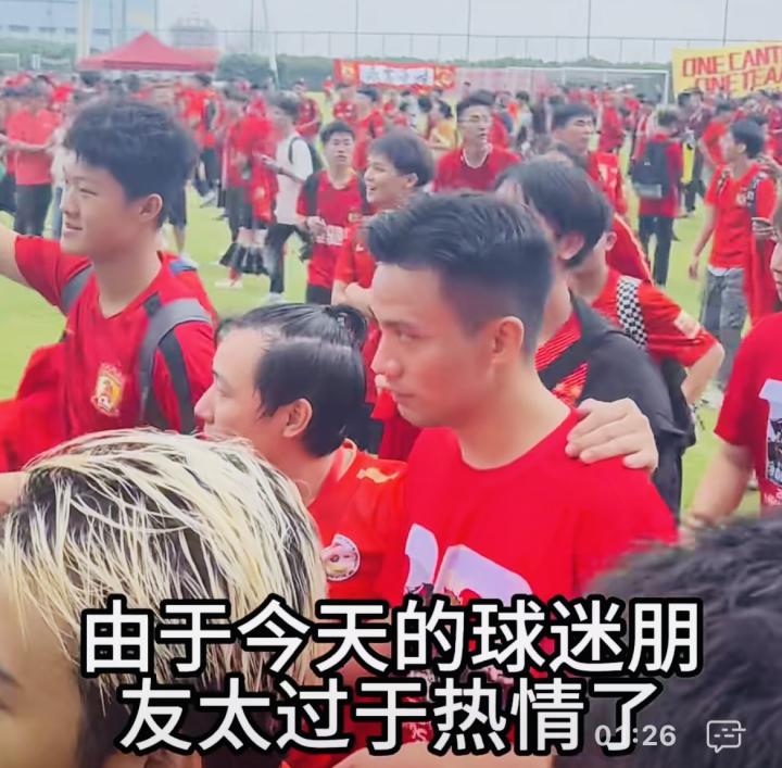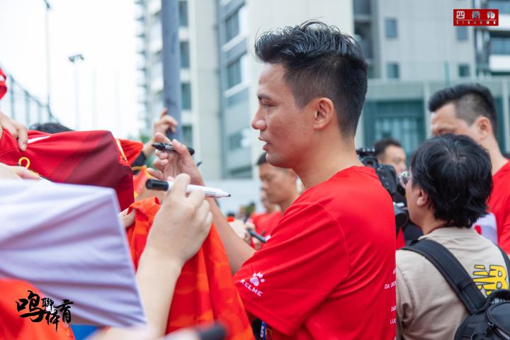 由于广州队亚冠10周年纪念庆典现场有超过一千名从四面八方赶来的广州球迷前来助兴,现场工作人员人手有限,难以做到秩序井然。与此同时,功勋球员们与大家难得相聚,肯定要满足球迷签名合影的心愿,因此在互动环节,即便是训练场地这种开放空间,似乎也被球迷的热情包裹严实,甚至有地方不够用的感觉!当天但凡能拿到广州队功勋球员签名的朋友,都是幸运儿,因此原本“鸣聊体育”与广州仔冯俊彦约好的访谈,由于现场环境使然,根本无法进行,只能遗憾错过……