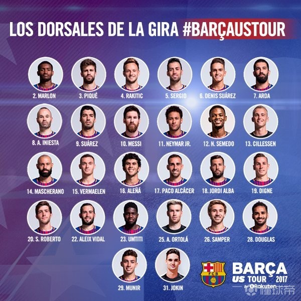 马龙(2),皮克(3),拉基蒂奇(4),布斯克茨(5),德尼斯-苏亚雷斯(6),图兰(7),伊涅斯塔(8),苏亚雷斯(9),梅西(10),内马尔(11),塞梅多(12),西莱森(13),马斯切拉诺(14),维尔马伦(15),阿莱尼亚(16),帕科(17),阿尔巴(18),迪涅(19),罗贝托(20),比达尔(22),乌姆蒂蒂(23),奥尔托拉(25),桑佩尔(26),道格拉斯(28),穆尼尔(29),埃斯杰塔(31)。